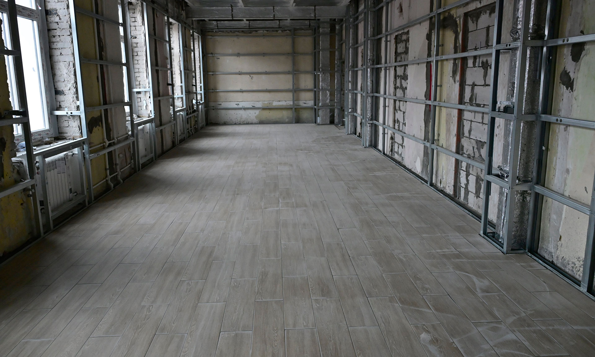 Во всем здании учебного корпуса идет чистовая отделка. Четвертый этаж уже через две недели будет готов — работы ведутся с верхних этажей здания. На всех этажах работают бригады в усиленном темпе. В декабре все четыре этажа планируется сдать, чтобы студенты уже могли заниматься в собственном здании.