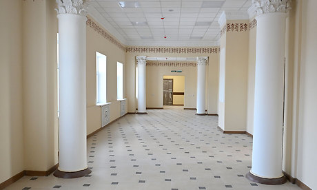 Самая тяжелая и сложная работа позади: укреплены несущие конструкции здания — стены и перекрытия, обновлен фасад, сделана новая кровля, заново проложена электрика, водопровод, канализация. Александр Богомаз вместе с Петром Глыбочко осмотрели все четыре этажа.