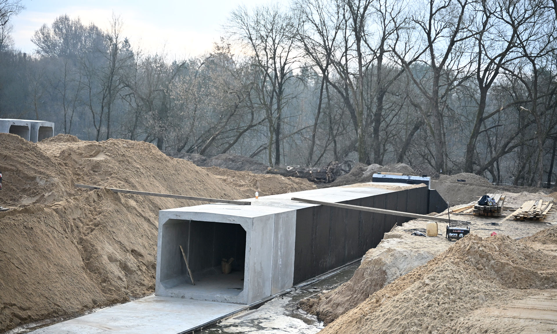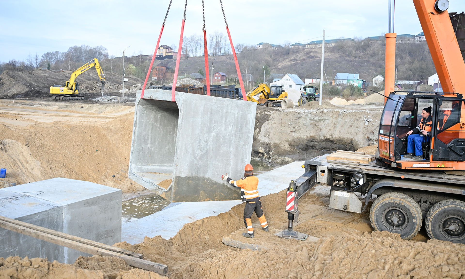 Первый этап строительства начался в прошлом году. Уже проведена большая работа по подготовке основания, расчистке от древесной растительности и кустарников, выполнены работы по устройству насыпи из песка, частично подготовлено свайное поле. Ведутся работы по устройству водопропускных сооружений, ресурсоснабжающими организациями — по выносу линий электропередач 110 и 10 кВ, сетей газоснабжения, водоснабжения и канализации.