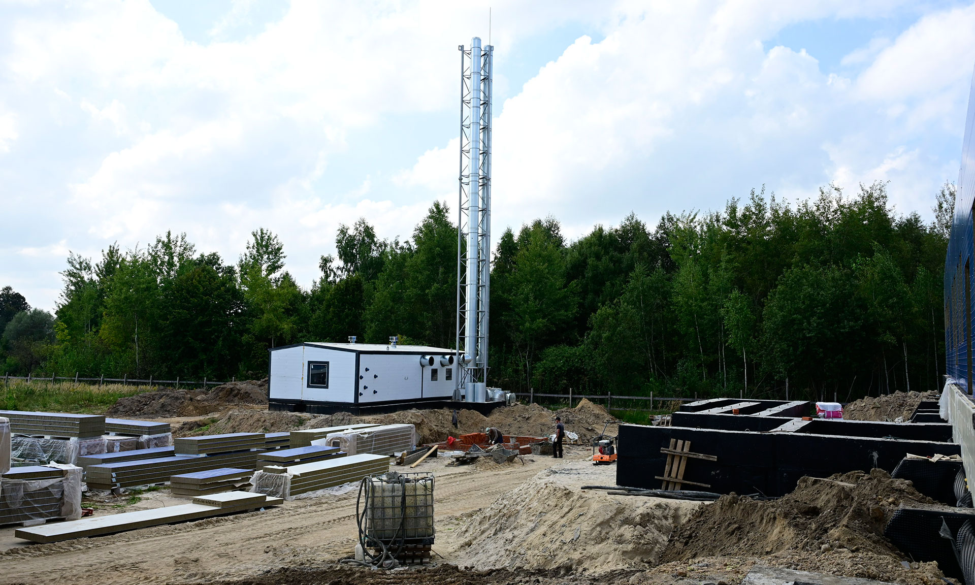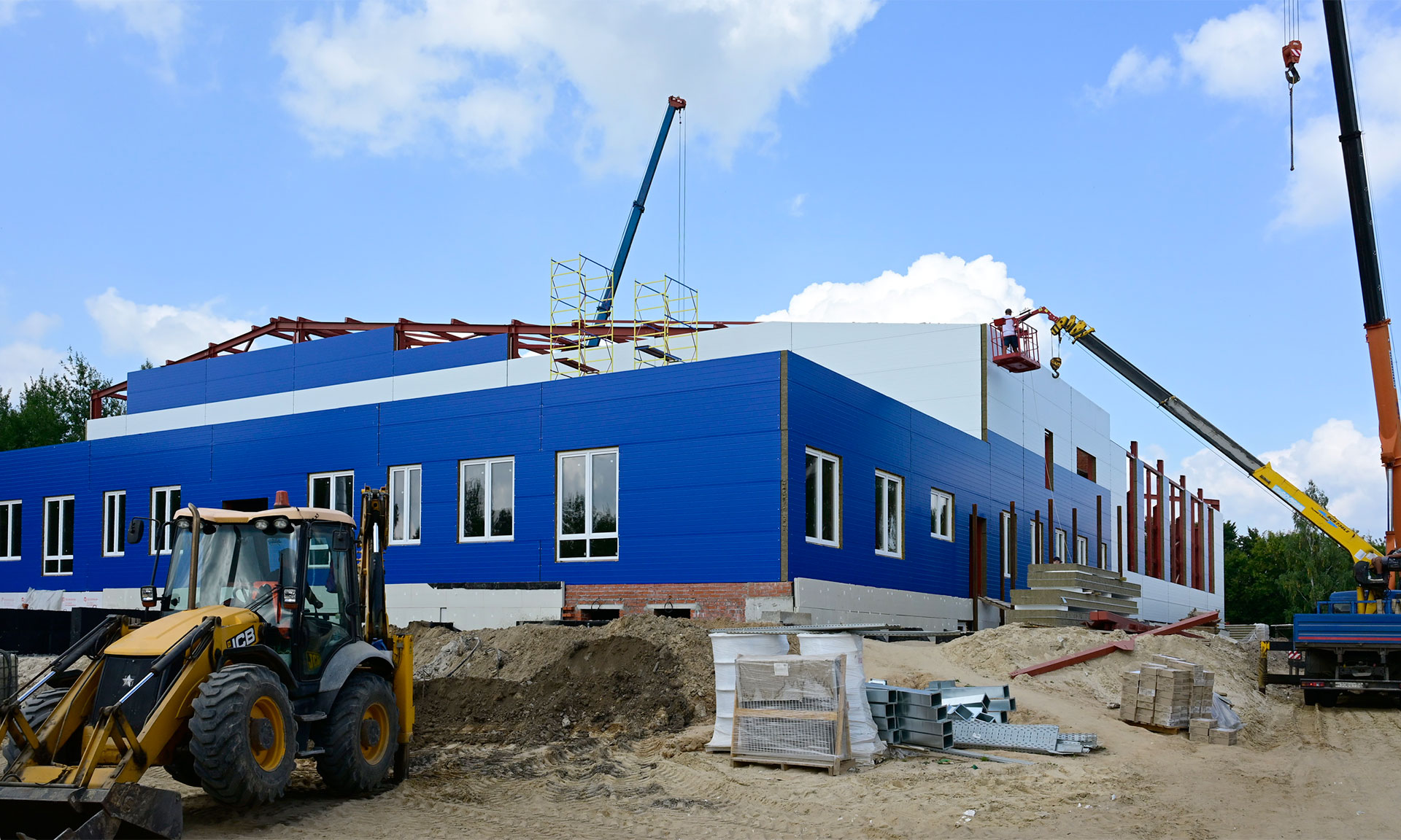 Ведутся работы по монтажу ферм для кровли, стеновых панелей, чаши бассейна. Но темп работ оставляет желать лучшего — есть отставание от графика, нужно увеличить количество людей на объекте.